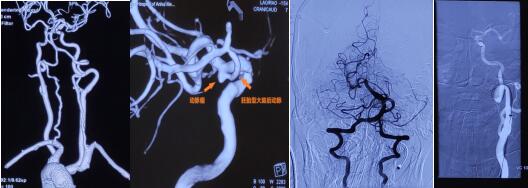 图1、2、3、4 术前CTA、DSA提示动脉瘤位置、与胚胎型大脑后动脉等相关血管关系及双侧迂曲的颈内动脉