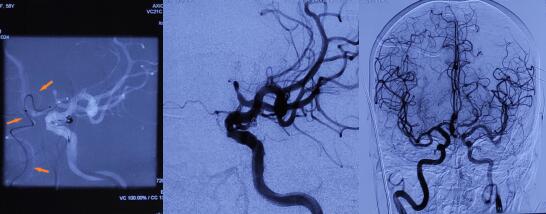 图5、6、7 术中颅内动脉瘤栓塞完全,各相关血管保护良好