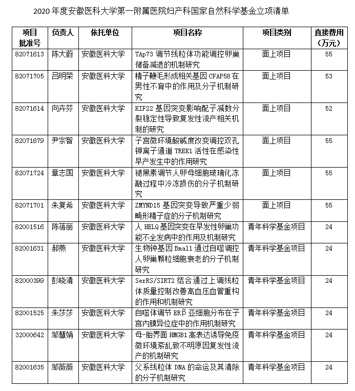 在刚刚公布的2020年度国家自然科学基金集中申请项目评审结果(第二批)中,我院妇产科共获批立项课题12项,其中面上项目6项,青年基金6项,总资助经费达469万元,取得了历史性突破。