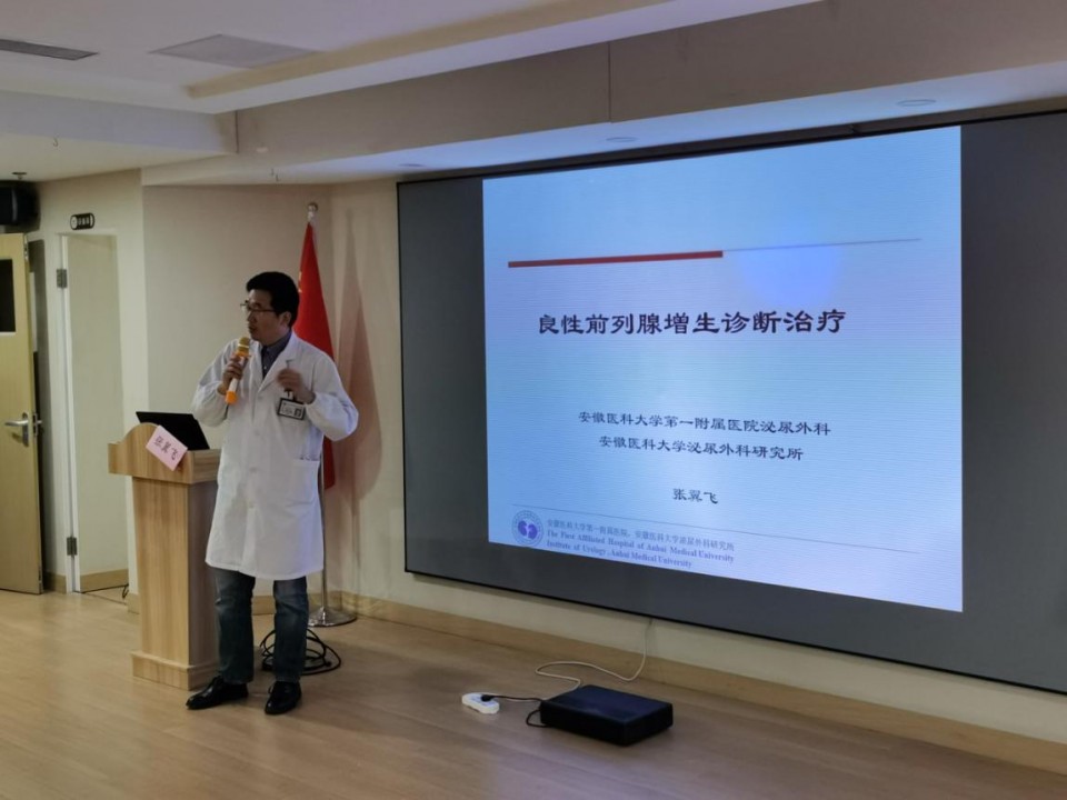 泌尿外科的专家们进行了健康科普讲座,泌尿外科下沉社区的刘玲主持了本次活动。张翼飞主任就老年男性因前列腺肥大而出现小便次数增多、排尿费力、排尿困难、夜尿增多的情况讲解了前列腺增生的诊断与治疗。
