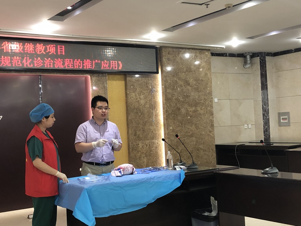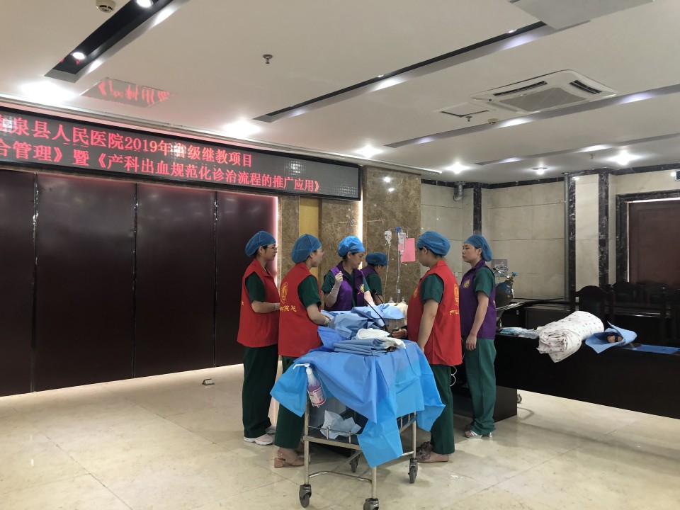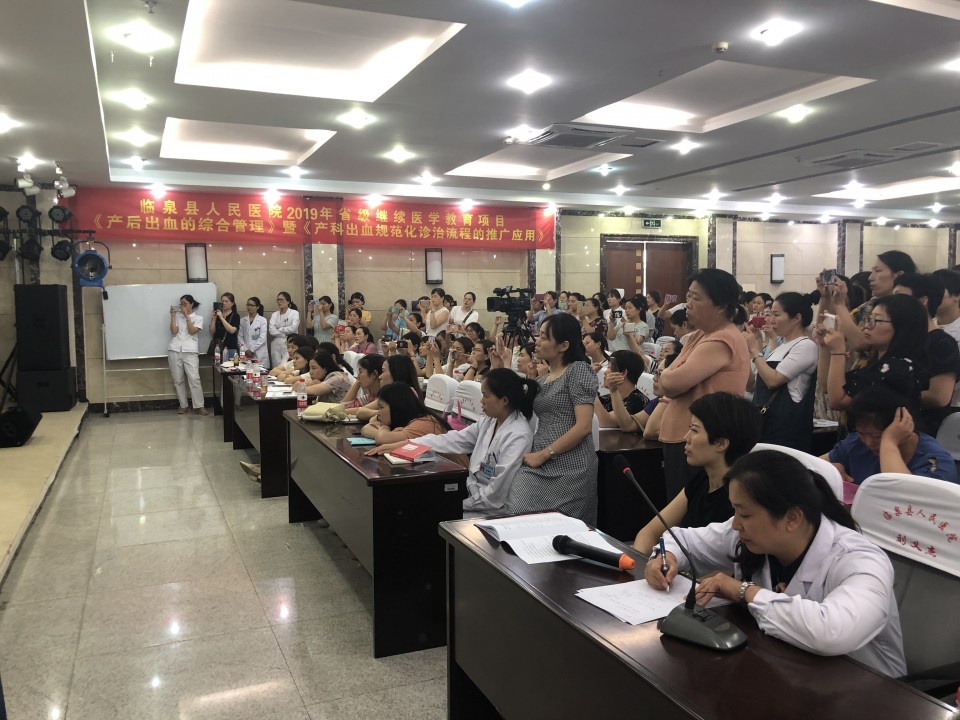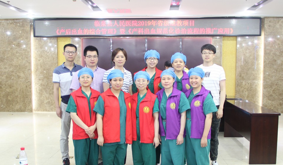 为促进我省基层医疗卫生机构对产科出血的规范诊治,提高产科出血救治水平,降低孕产妇死亡率,我院产科团队依托省卫生健康委适宜技术推广项目 “产科出血规范化诊治流程的推广应用”,于2019年6月15日赴临泉县人民医院开展产科出血规范化诊治技术指导及应急演练。本次项目推广由项目负责人产科杨媛媛主任带队,由医生、护士及助产士等共11人组成。会议先由杨主任先结合我省基本情况,从产科出血的病因、识别及预警、以及产科出血的规范化诊治的技术和流程改进,同与会代表作了详细分享。随后,产科危重症抢救小组现场进行产房产后出血应急演练,生动完整地呈现了产房产后出血的救治过程。最后,危重抢救小组成员还通过子宫模型手把手演示了子宫按摩、软产道探查、子宫捆绑、球囊放置和子宫动脉结扎等常用止血操作。