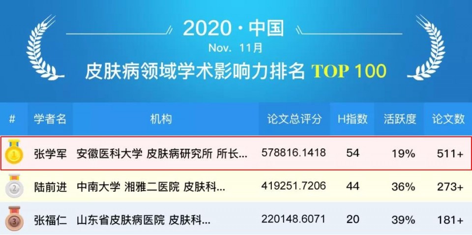 据悉,该榜单是依托于北京同舟云网络信息技术有限公司强大的信息处理与数据挖掘技术、独立开展的公益性研究项目,基于"全球学者库"的海量论文数据,针对皮肤科领域,广泛采集中国学者的相关论文综合考虑论文被引频次、论文类型、作者署名排位、作者H指数、学术活跃度、学科专业聚焦度等多种重要因素,设置权重,精确评价学者的学术影响力。