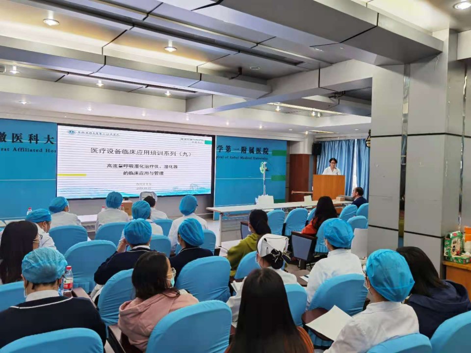 针对防范新冠疫情需要,11月20日下午, “高流量呼吸湿化治疗仪、湿化器的临床应用与管理培训班”在我院中心实验楼6楼会议室举行。本次培训由物资设备处根据疫情防控精心策划筹办,医院各ICU、急诊科、心内科、呼吸内科、普胸外科、心外科、儿科等临床科室近120名医护人员来到现场参加培训。