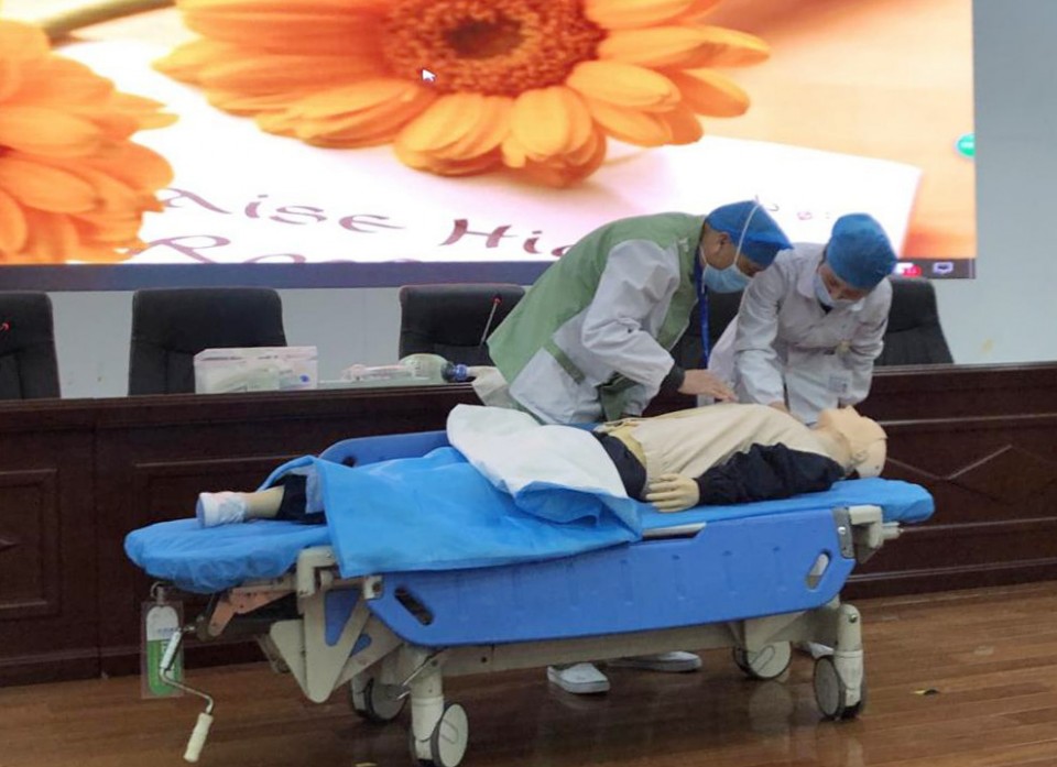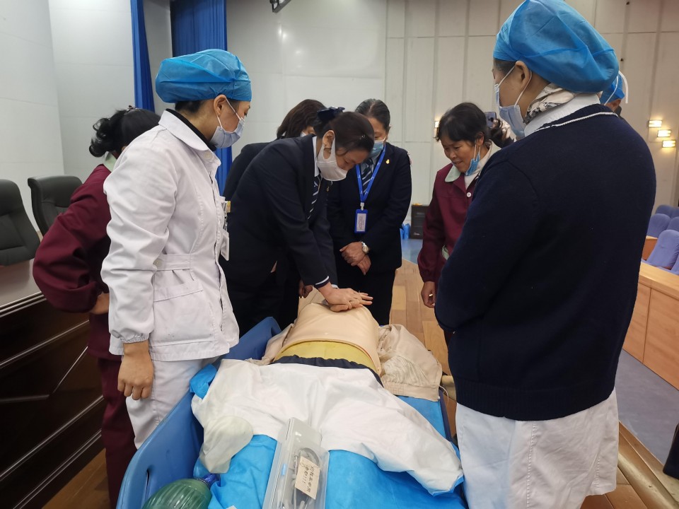 最后,急诊医学科刘玉妮、刘欢欢为我院后勤辅助人员演示了心肺复苏的具体步骤及注意事项,并为演练人员进行详细指导。我院后勤人员积极参加,现场反响强烈。