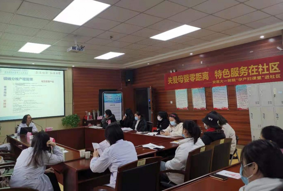 为大力宣传普及母婴保健知识,提高辖区内群众优生优育水平,将三甲医院优质医疗保健资源送到社区,12月11日下午,由我院产科姚洁副主任医师、产房张凤英护士长、产科二病区王凤英护士长及产房病房的骨干助产士和护士一行6人,在我院下沉社区医院主管护师刘玲的协调安排下,来到我院定点医联体四里河街道社区卫生服务中心,开展了一场主题为“关爱母婴零距离,特色服务在社区 ”的孕产期保健课堂和义诊活动。