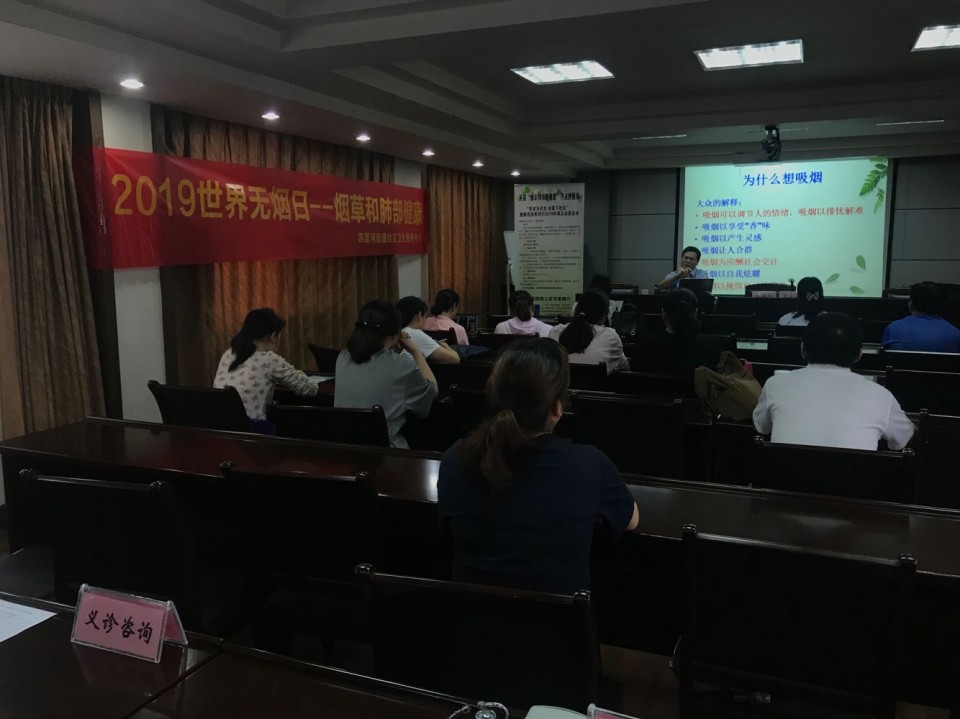 5月30日下午,在5.31世界无烟日来临之际,为大力宣传烟草危害,传播控烟知识,提高公众对烟草危害的认识,营造公共场所无烟环境,倡导健康的生活方式。安徽医科大学第一附属医院呼吸科党支部书记、副主任医师李永怀应四里河社区卫生服务中心的邀请,为四里河街道居民及合肥市工程监理公司送去一堂生动的戒烟相关讲座 ,为大家普及戒烟的相关知识,从吸烟的危害、戒烟的益处、戒烟中的阻碍因素到如何克困难,成功戒烟。使现场的居民及企业员工受益匪浅。