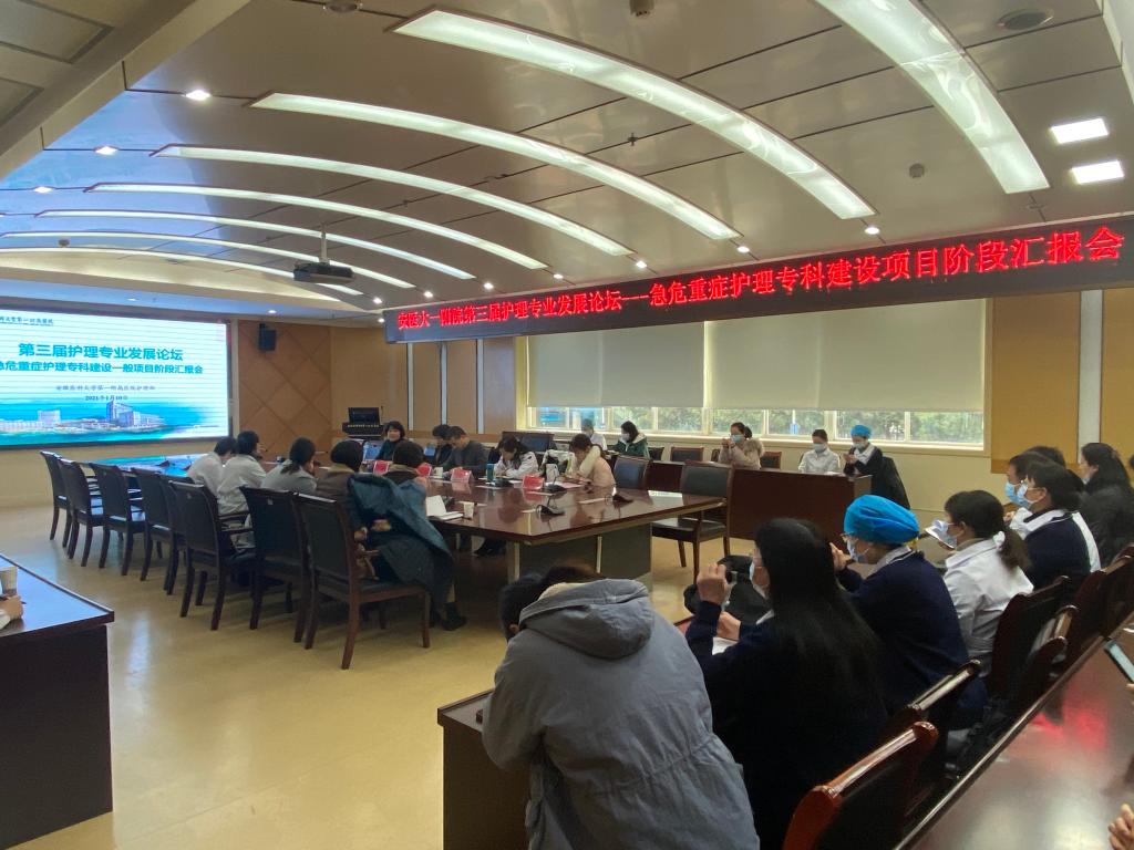1月10日下午,由护理部组织,在中心实验楼六楼学术报告厅、干部保健中心二楼会议室分两个会场召开第三届护理专业发展论坛---急危重症护理专科建设项目阶段汇报会。会议邀请安医大公共卫生学院流行病与卫生统计学系副主任范引光教授、潘海峰教授,安医大护理学院李惠萍教授、谢伦芳副教授,医院重症医学科王翠博士、曹利勉博士担任点评专家。会议由护理部主任胡少华、护理教研室副主任丁金霞、肝胆胰外科一病区护士长任春霞主持,项目负责人、相关科室护士长、科研护士、护理研究生参加会议,参会人员严格落实新冠疫情防控措施。