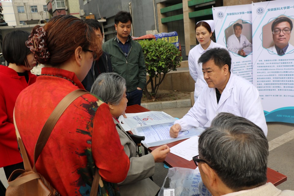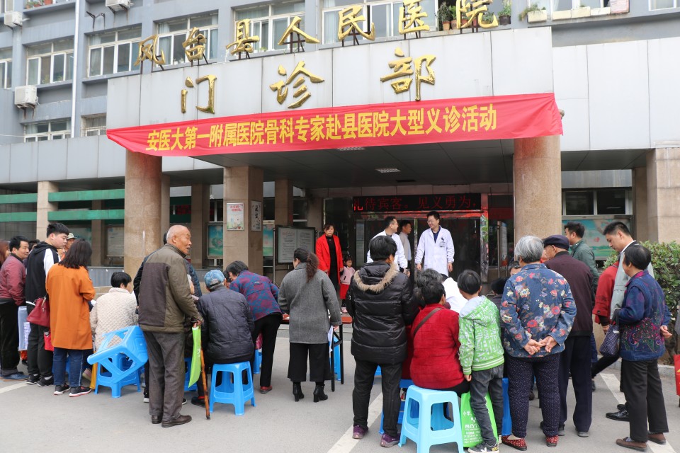 为响应城市公立医院改革精神,推进医院优质医疗资源下基层,2019年4月27日,关节外科团队赴凤台县人民医院开展义诊与学术交流活动,义诊团队由尹宗生主任、李鸿主任、刘必全主任、刘敬军副主任、陆鸣主治医师、高维陆主治医师、李叶天主治医师等人组成。一个上午的时间迎来了逾百名前来咨询和寻求专科诊治的患者,广大患者朋友对这种在家门口就能得到了知名专家诊治的活动表示热烈的欢迎和极大的热情。