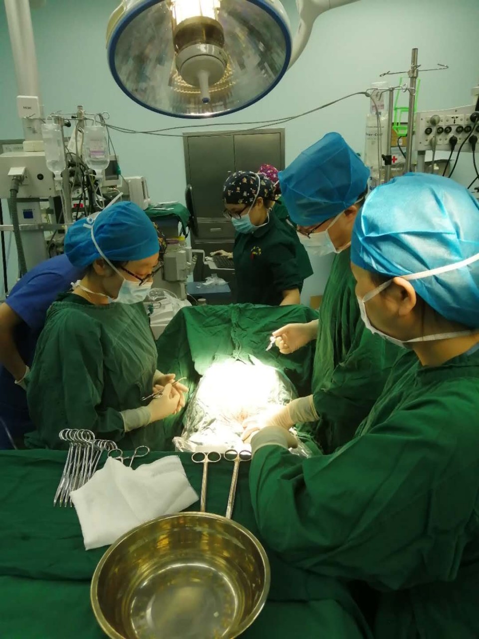 3月16日早上7点,妇产科叶伟医师、杜雪医师对吴女士实施了剖宫产手术,吴女士顺利产下一名健康女婴,因考虑长时间体外循环及全身肝素化可能导致难以控制的产后大出血,且刘女士尚年轻,若切除子宫将永久失去生育功能。经产科团队讨论后行决定保留子宫,同时行改良子宫捆绑术+双侧髂内动脉结扎术+双侧子宫动脉上行支结扎及卵巢固有韧带下结扎术预防产后出血。上午10点,手术顺利结束。然而,危险并没有排除。这只是为凶险的主动脉夹层拆除了一颗“定时炸弹”。心外科冯俊波副主任医师、胡运涛博士、李俊涛医师、王亚朋医师、李艳丽主任及体外循环团队立即开始生命接力,对吴女士实施主动脉夹层手术。手术中发现吴女士主动脉根部已经破裂、血性心包积液填满整个心包腔。下午14:30,手术顺利结束。这场历经7个半小时的生死抢救,全体医护人员合力奋战,最终换来了吴女士二人母女平安。