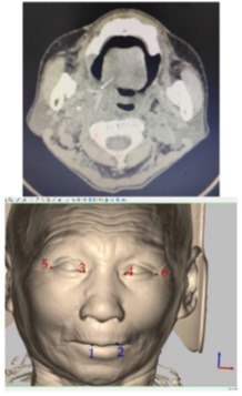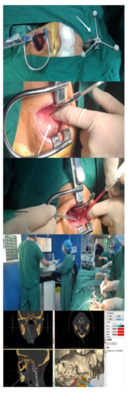 图1术前颌面部CT影像及导航规划图,上图剪头所指为异物