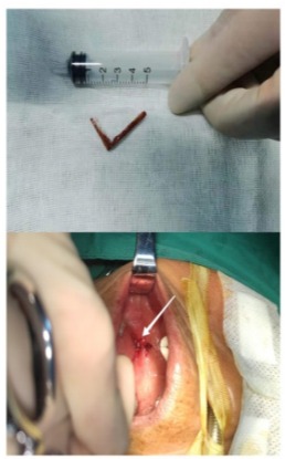 患者程某某,安徽岳西人,8个月前因务农时不慎摔倒致毛竹插入口腔,先后求治于当地县、市两级医院,分别行保守、手术治疗后,患者仍觉口内疼痛不适,影响张口,辗转多地后于来到我院口腔颌面外科求治。患者入院后积极完善相关检验检查,颌面部CT示:右侧口咽旁软组织明显增厚,伴线样异物影。经治疗组孙明副主任医师评估后发现,异物滞留时间长且位于腭咽部软组织内,毗邻众多重要解剖结构且术野受限,异物能否找到、找到后能否完整取出、如何把损伤降到最低均是对外科医生的挑战。