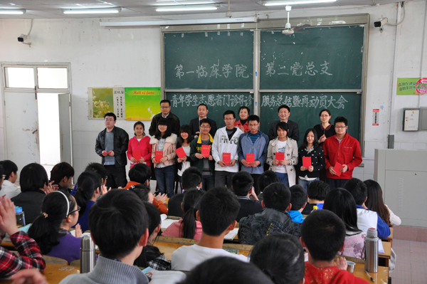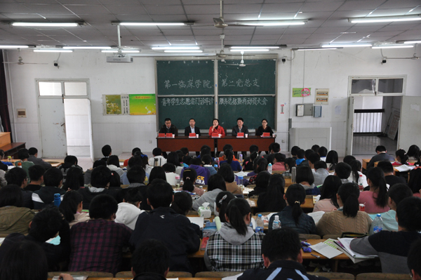 4月11日下午,我院与第一临床学院第二党总支共同举行“东南风医学生爱心社”志愿者义务导诊活动中期总结暨动员大会,第一临床学院第二党总支书记黄朝晖、副书记刘从云,我院党委委员、党委工作部部长高长林,门诊部主任李维荣,团委书记黄尧出席会议。第一临床学院二总支2011本硕全体同学等200余人参加了会议。