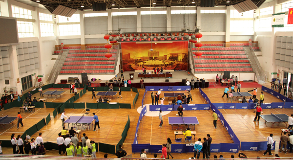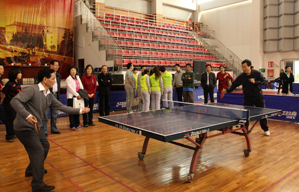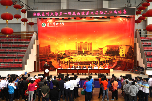 4月19日, 我院第九届职工乒乓球赛在安医大体育馆成功举办。大学常务副校长江敏、院党委书记梁朝朝、副书记刘全礼、纪委书记王润玲、副院长尹宗生、党委委员高长林、李伦兰等出席开幕式。党委书记梁朝朝致开幕词,院长余永强在闭幕式上致闭幕词。党委委员、党委工作部部长高长林就安医大一附院乒乓球协会的 筹备工作做了情况说明。