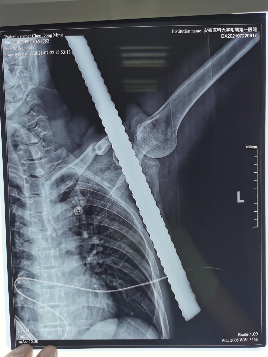 7月22日下午4时许,医院急诊室送入了一名特殊的患者,一根50厘米长,2.5厘米粗的钢筋,赫然贯穿在患者陈先生的左肩。拇指粗的钢筋从陈先生左肩后方插入,左侧前方胸壁穿出。