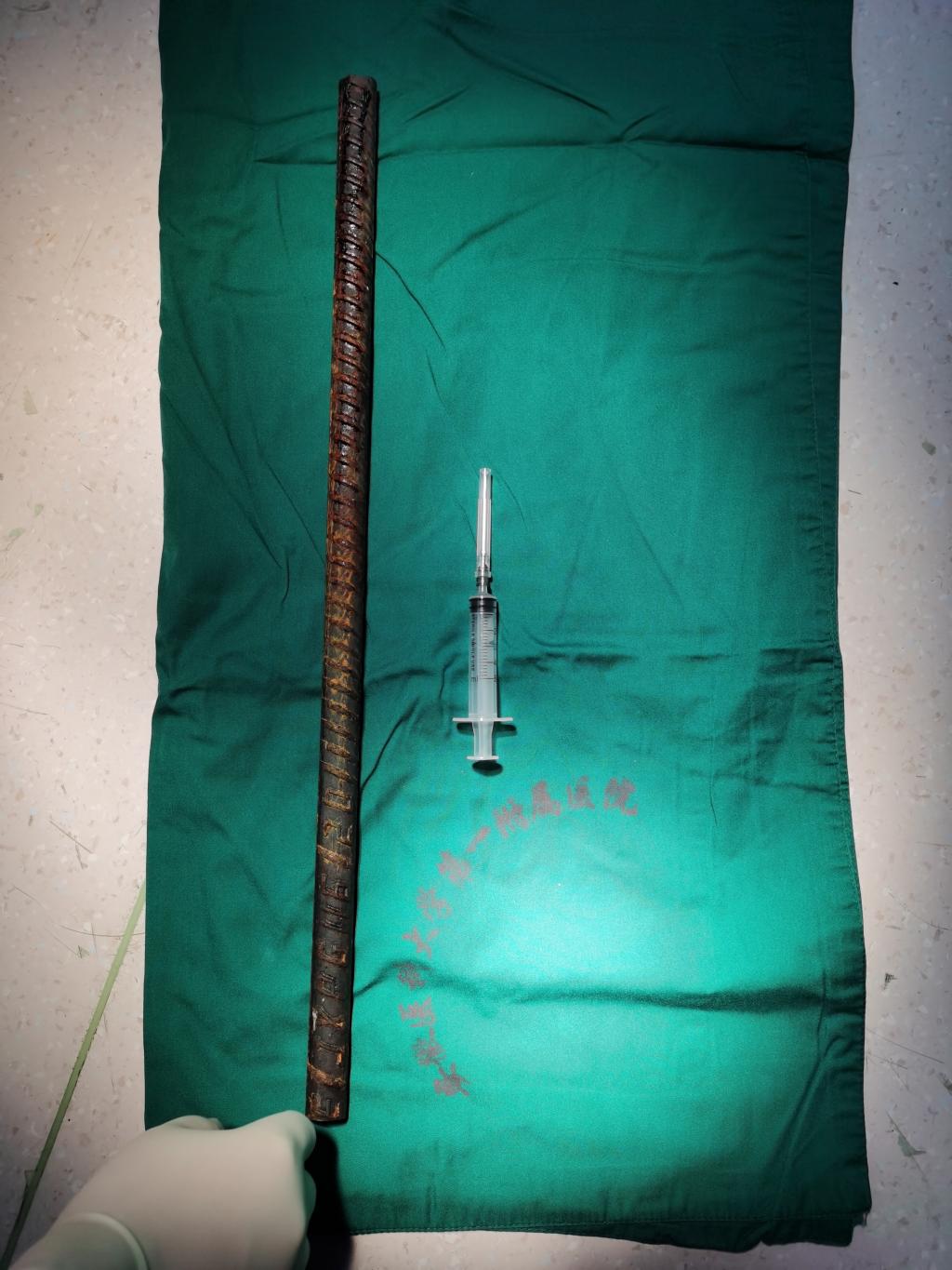 我院急诊科迅速启动绿色通道,经初步影像学检查后,胸外科、创伤骨科等多学科迅速响应会诊,创伤骨科住院总医师严超及二线班张月雷副主任医师经仔细查体和阅片,发现患者的锁骨骨折,钢筋从胸壁前方胸大肌深处贯穿,幸运地避开了锁骨下方及腋窝的重要血管神经。经急诊科完善术前检查后,由创伤骨科、手术室、麻醉科多团队协作,手术历经一小时,钢筋成功被取出。术后患者左上肢活动自如,末梢感觉及运动正常。因钢筋污染较重,患者伤口后续仍有感染风险,将继续在创伤骨科住院观察。