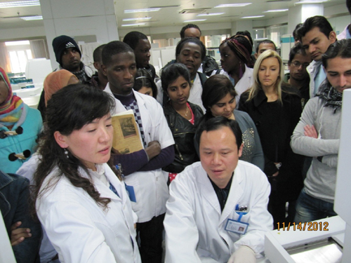 近日,检验科针对安医大国际教育学院的留学生开办了双语实践课,课上检验科老师耐心向外国留学生介绍了临床检验常用的各项仪器的结构、原理,并且现场演示仪器的操作方法、并对检验结果进行解释分析。通过此类双语实践课,更好的加深了同学们对于理论知识的理解,同时也加强了检验科与外籍留学生的交流,推动了检验课程国际化的发展。