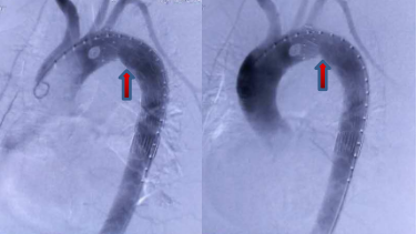 术中主动脉造影:主动脉弓小弯侧主动脉壁向外膨出