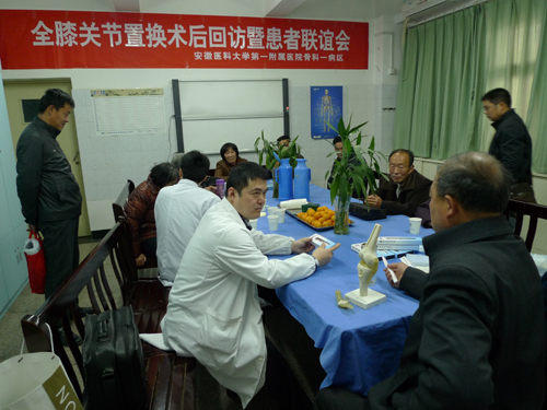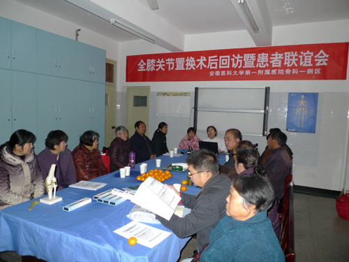 2012年12月1日上午,骨科一病区在会议室举办首届“全膝关节置换术后回访暨患者联谊会”。为今年1月以来在该病区行人工全膝关节置换手术的患者进行了现场回访及膝关节功能评分,30余位患者及其家属参加了此次联谊会活动。