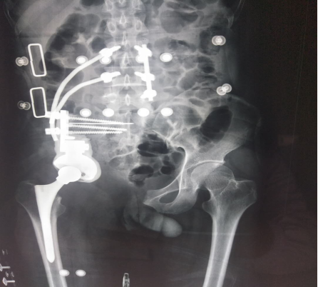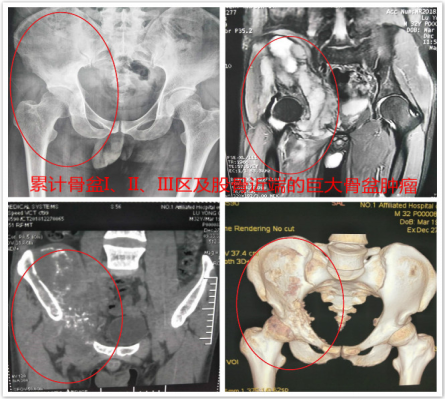 患者33岁男性,髋部疼痛不适3月余入院,经检查及病理提示骨盆I+Ⅱ+Ⅲ区巨大恶性骨肿瘤。骨盆的恶性肿瘤,往往就诊时肿瘤已经发展了相当长的时间,而肿瘤巨大、术中出血多、局部解剖结构复杂等因素使得手术难度及风险增高。早年对骨盆恶性肿瘤的治疗,半骨盆截肢术是骨盆恶性肿瘤的主要治疗方式。但患者所承受的心理压力巨大,面对肢体残缺所引起的恐慌使其拒绝接受治疗,尤其对于年轻患者。保肢术的开展及应用为这些患者带来希望,但手术难度极大,不易达到安全的外科边界。胡勇教授团队根据患者病情,制定精细手术方案,多套治疗及手术预案,于我科行3次化疗,缩小肿瘤反应区。积极完善术前准备工作后于患者行骨盆I+Ⅱ+Ⅲ区巨大骨肉瘤行腹主动脉球囊阻断+半骨盆肿瘤切除+腰骶椎骨盆重建+髋关节置换术,术中既完整切除了巨大骨盆肿瘤,又重建了腰骶椎及骨盆、髋臼的稳定性,最大程度的保留肢体功能,患者术后恢复良好,顺利出院。