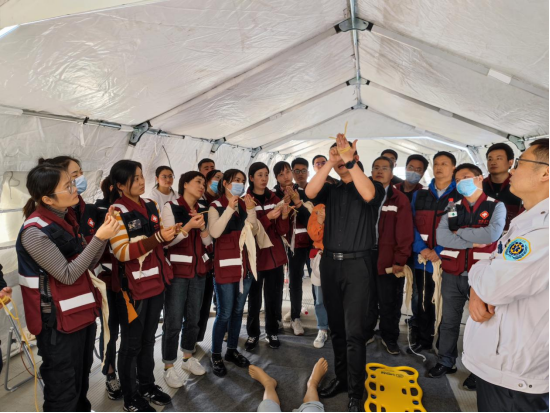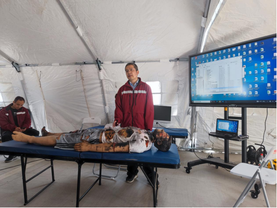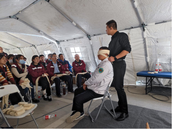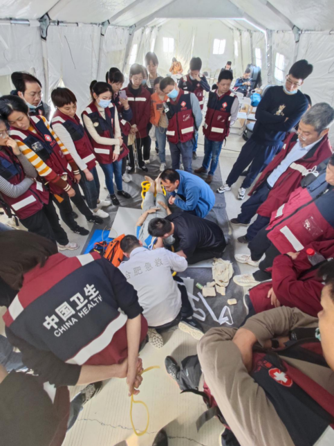 23日,上午9点,医疗队结合应急工作热点,邀请合肥市急救中心、我院烧伤科专家对参与本次演练的医护队员于帐篷医院内开展了灾害救援现场处置培训、突发天然气爆炸伤烧伤急救培训、高端模拟人使用培训等系列应急相关理论培训项目。同时,信息中心队员依托“安徽省紧急医学救护基地”信息化设备,完成了无人机现场勘查监控与信息化互联互通工作。中午12点,后勤队员完成了医疗队午餐的自我生存保障工作。
