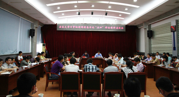 5月16日下午,安医大举行学习胡锦涛总书记“五四”重要讲话精神座谈会,我院第十七团支部张巧云、第二十二团支部吴丹参加了会议。座谈会由校党委副书记刘群英主持,校党委书记李俊出席并讲话。