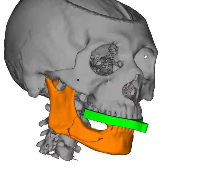 在口腔科后军主任指导下,临床数字医学转化中心团队通过对患者颌面部CT数据的处理,进行骨折虚拟复位,重建骨折断端,设计重建后头模,并在此基础上进行手术导板和咬合导板的设计。运用3D打印技术制作头模、导板。在手术中,在后军、薛浩伟医疗团队术前通过对患者3D打印头模对患者手术方案进行精细化设计、运用头模对钛板进行预成型。通过咬合导板和手术导板对患者进行了精准、微创、快速的手术治疗。