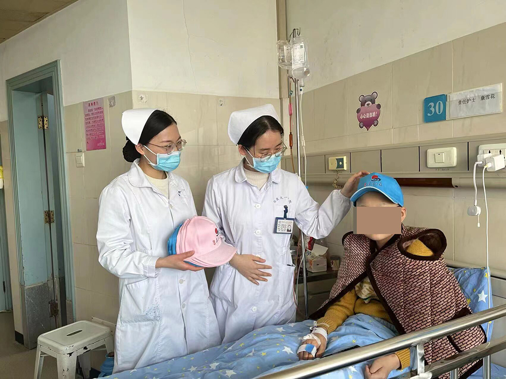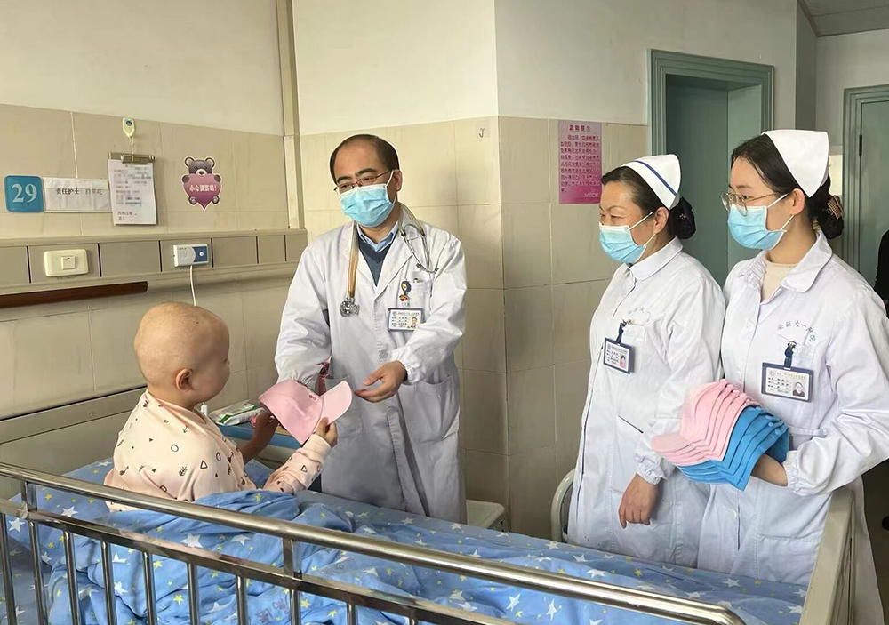 在儿童呼吸血液内分泌病区,丁圣刚主任医师、蒋慧珍护士长与第一(儿科)团支部的团员青年们一起,亲切的为患儿送上帽子,检查患儿情况并鼓励他们积极接受治疗,勇敢战胜病魔。医护人员们表示,对于孩子们和家长来说,每一顶充满爱的帽子都是一束阳光,照进身处阴霾中的病患家庭,让饱受病痛和心理摧残的孩子有战胜病痛的希望,感受关爱与平等。