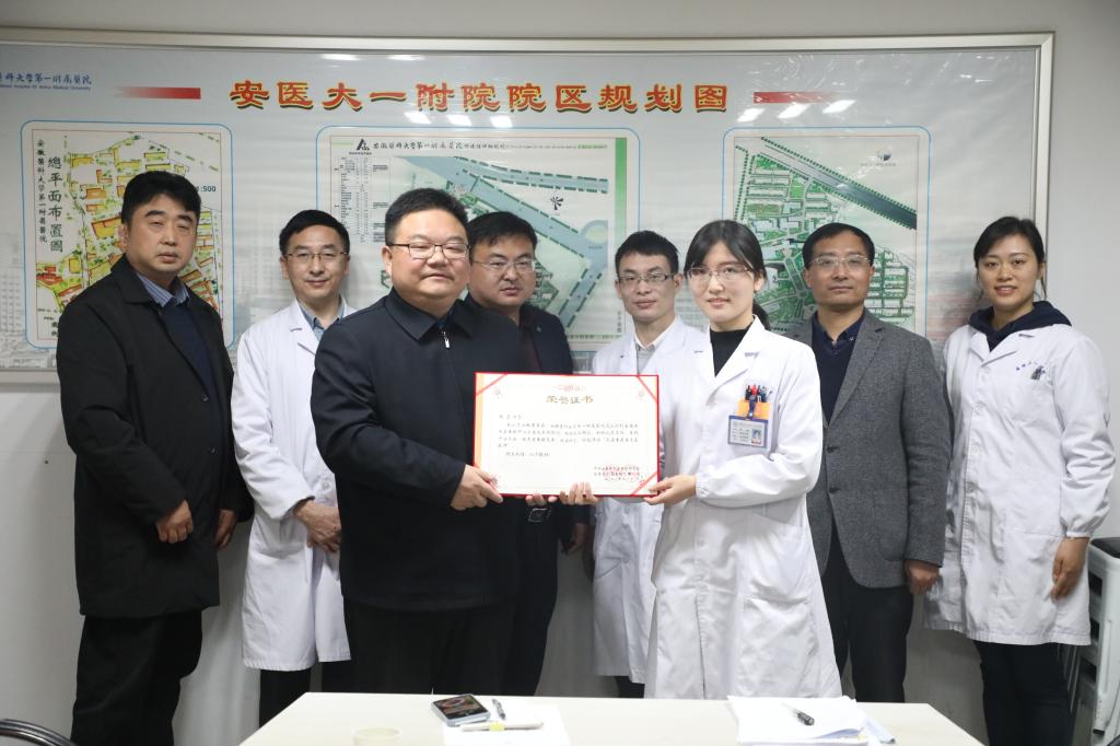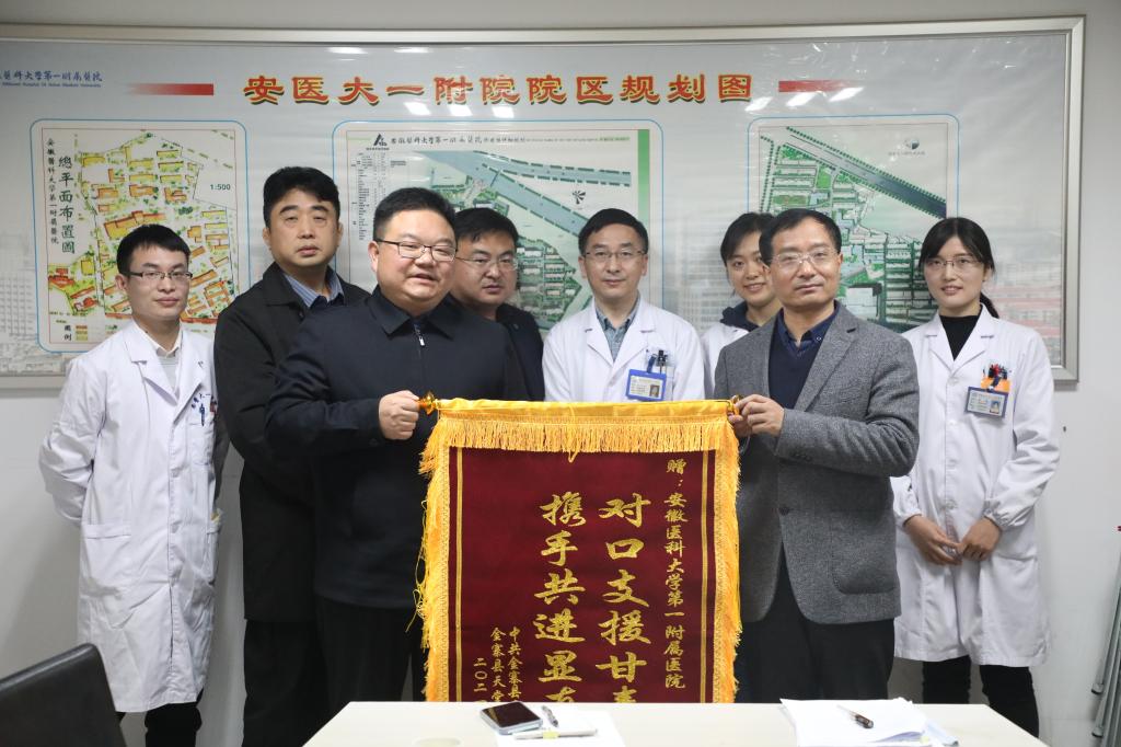 12月7日,金寨县天堂寨镇党委书记王振宇及天堂寨镇中心卫生院院长陈文合来到医院,向医院送来了印有“对口支援甘奉献 携手共进显真情”的锦旗,感谢安徽医科大学第一附属医院的倾情帮扶及对天堂寨镇村民所给予的大力帮助。