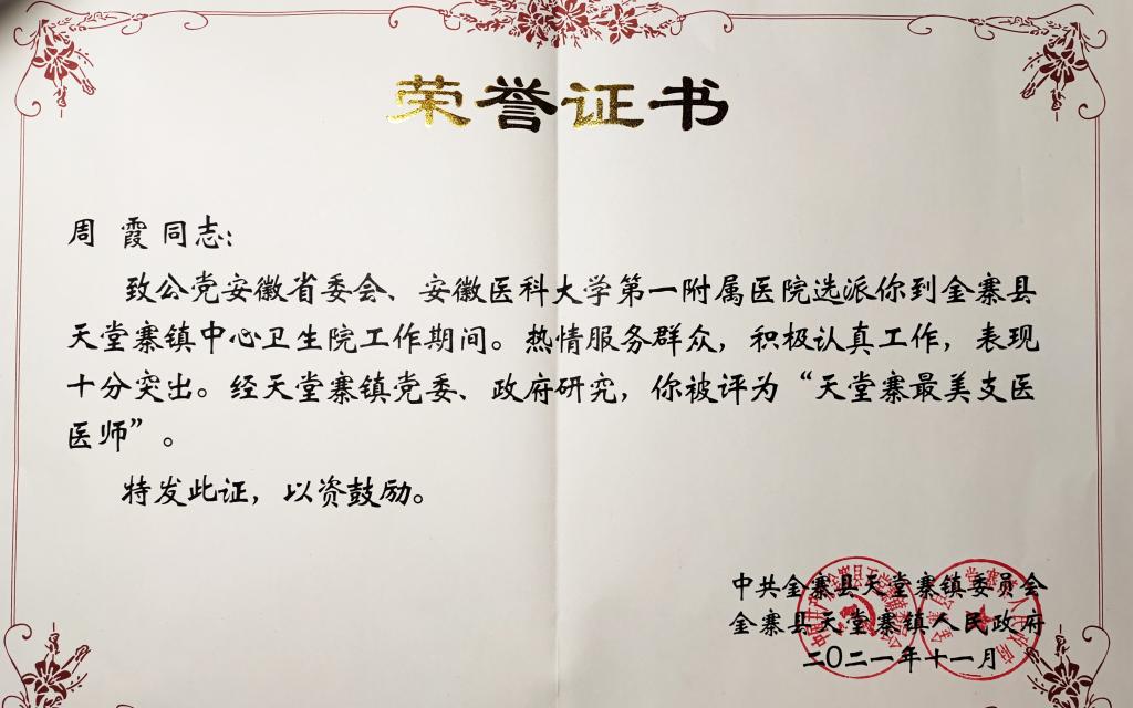 安徽省卫建委及安徽省致公党对此项工作高度重视。6月22日全国人大常委会委员、省人大常委会副主任、致公党省委会主委谢广祥带领致公党部分委员及市县级领导到卫生院看望帮扶专家,并关切和指导帮扶工作开展。12月初,谢主委和各基层致公党委员再次来到天堂寨镇看望大家并就半年以来的工作进行总结大会,医院周霞主治医师作为三家帮扶医院支医代表在大会上发言,将驻点帮扶半年来的所见、所闻、所感及开展的工作、取得的成绩和存在的不足进行总结汇报,获得了高度肯定和赞扬。同时,周霞也被天堂寨镇党委及政府授予“天堂寨最美支医医师”荣誉称号。