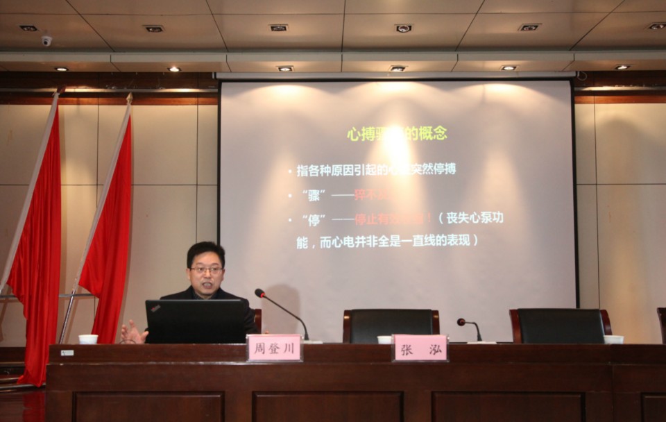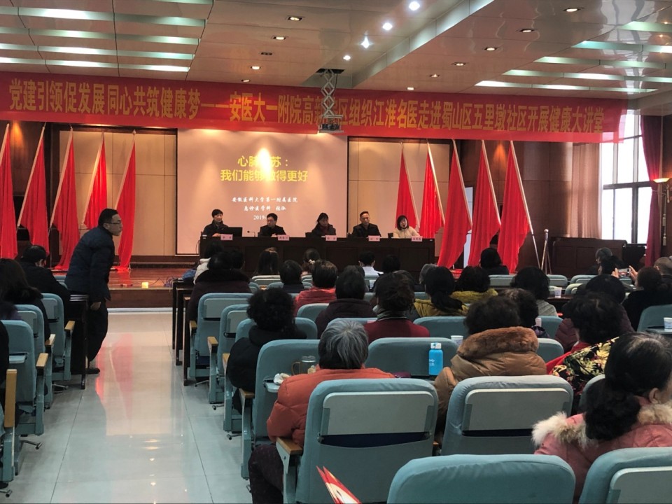 在倡议“1.20国家急救日”前一天,为向基层医务工作者以及社区居民普及心肺复苏相关知识,高新院区及医院门诊党支部于1月19日前往蜀山区五里墩街道党工委联合开展“融合党建”活动,并组织江淮名医走进社区开展大型健康科普讲座。高新院区副院长、医院急诊医学科学科带头人、我省江淮名医张泓教授首先向大家介绍加强城乡急救体系的建设,提高全社会自救互救能力以及心肺复苏的重要性。高新院区急诊科负责人周登川主任随后从心搏骤停和心肺复苏的相关知识、心肺复苏的操作技能等三个方面向现场听众进行讲解,200多人的会议中心座无虚席,社区居民们听得全神贯注。之后心肺复苏操作演示环节,社区医务工作者们踊跃参加,居民们也跃跃欲试。