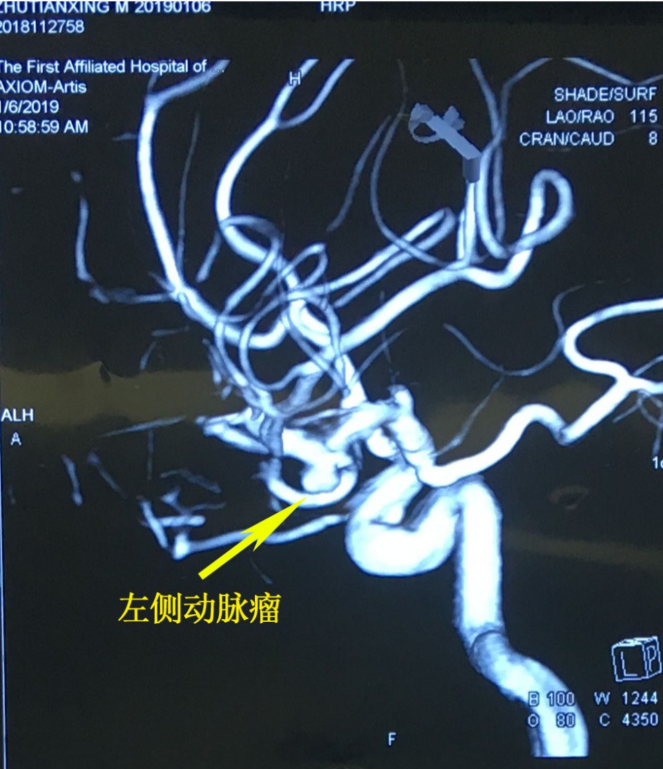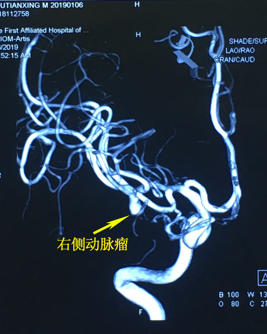 据悉,患者,男,55岁,来自安庆宿松县,既往有过剧烈头痛病史,但当时未在意,此次系头部外伤于当地医院就诊,提示“右侧颅内占位性病变”,遂于我院就诊,入院后行造影检查,确诊是双侧大脑中动脉分叉处动脉瘤,且右侧大脑中动脉动脉瘤曾经发生过破裂。科室讨论后认为:该患者颅内多发动脉瘤可以考虑介入栓塞治疗,但双侧栓塞费用非常高;也可考虑行开颅夹闭治疗,从单侧翼点入路夹闭双侧动脉瘤,这样既可降低治疗费用,同时可以切除动脉瘤,从而解决动脉瘤占位效应引起癫痫等并发症。与家属充分沟通后,家属同意选择开颅动脉瘤夹闭手术。