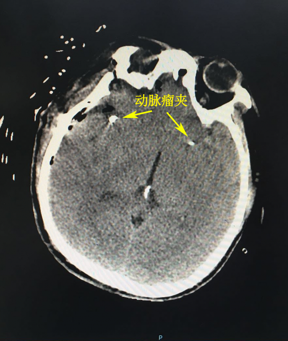 该手术由病区主任王晓健指导,胡阳春副主任医师主刀完成,手术选择从右侧翼点入路,首先暴露右侧大脑中动脉分叉处动脉瘤,术中证实该动脉瘤瘤腔内血栓形成,周边粘连紧密,取动脉瘤夹FT726T将瘤颈塑性夹闭,保留M1-M2主干通畅,并切除瘤体,解除占位,分离出对侧大脑中动脉M1段分叉处动脉瘤,再用另一枚FT726T型动脉瘤夹夹闭瘤颈,穿刺证实动脉瘤夹闭完全,大脑中动脉主干保留完好。术后患者恢复良好,肢体活动正常,嗅觉不受影响,未遗留任何功能障碍。