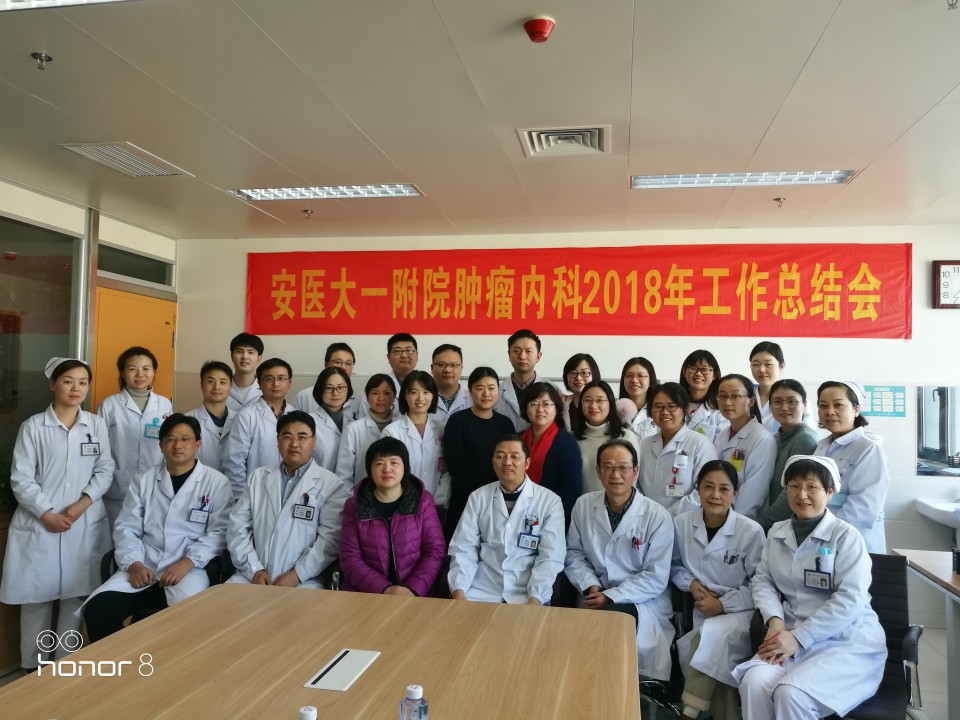 顾康生主任首先就2018年科室在临床、教学、科研等方面的工作情况以及2019年科室的总体工作思路和计划向与会人员作了汇报。2018年在院领导的关心支持和全体医务人员共同努力下,肿瘤内科在临床、教学、科研等方面取得了良好的成绩。全年岀院人数13553人,门诊量32966人,床位使用率107.92%,全年无医疗纠纷;发表论文57篇,SCI文章16篇,国内核心期刊26篇,新增国家自然科学基金2项,其他国家级课题2项,省级课题4项,北京卫健康公益基金1项;继续承担本科生及硕士研究生肿瘤学课程带教,全年带教本科生1000余人,硕士研究生60余人,一人获得“校级优秀教师”称号;每周四中午业务学习,从未间断,全年累计40余次。作为安徽省最大的抗肿瘤药物临床研究基地,2018年新启动31项临床研究项目,其中国际多中心研究9项,国内多中心21项。