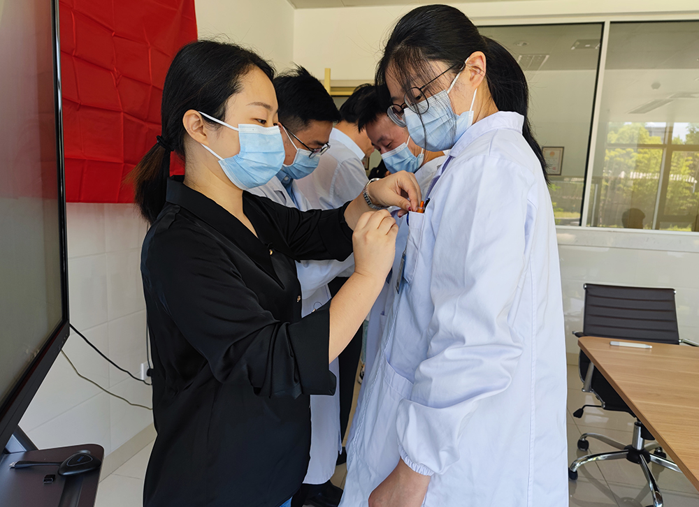 活动由团支部宣传委员刘曼丽带领全体共青团员重温入团誓词拉开序幕。王海宝、徐恩君和梁佳宁为各位团员佩戴团徽,向封院期间留守岗位的青年团员表示慰问,勉励大家努力工作,履行团员义务,为科室、医院的建设贡献自己的青春力量。