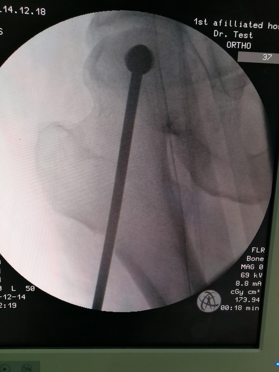 股骨头坏死是临床常见疾病之一,常见病因为股骨颈骨折、激素、酗酒等,若早期不进行干预治疗,一旦发生股骨头塌陷,将严重影响行走及日常生活,残疾率高,最终需行髋关节置换术。青壮年早期股骨头坏死的保髋治疗有效率在80%以上,目前国内主流的治疗方法是股骨头病灶清除减压+游离腓骨移植术,但是传统手术手术切口大,病灶定位需要大量射线透视,且不够精确,存在较大局限性。此次创伤骨科王刚主任团队,充分发挥我院“天玑”骨科机器人的优势,利用机器人导航精准定位股骨头坏死中心,再通过小切口进行自体腓骨移植,无需传统内固定辅助,极大地降低了患者费用,减少了术中辐射量。