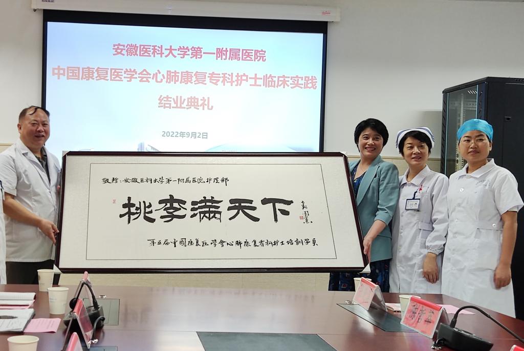结业典礼在学员学习、工作、生活的精彩回顾视频中拉开帷幕,徐阿曼和胡少华分别做总结讲话和致辞,对学员们顺利结业表示祝贺,希望学员们作为心肺康复护理事业的开拓者、先行者,在返回工作岗位后能够学以致用,共同推进心肺康复护理事业的发展。学员们均表示从临床实践欢迎会,到中期座谈会,再到结业典礼,不仅学习了心肺康复护理前沿的知识技能,更感受到了医院浓厚的人文关怀氛围,并赠送“桃李满天下”牌匾以示感谢。