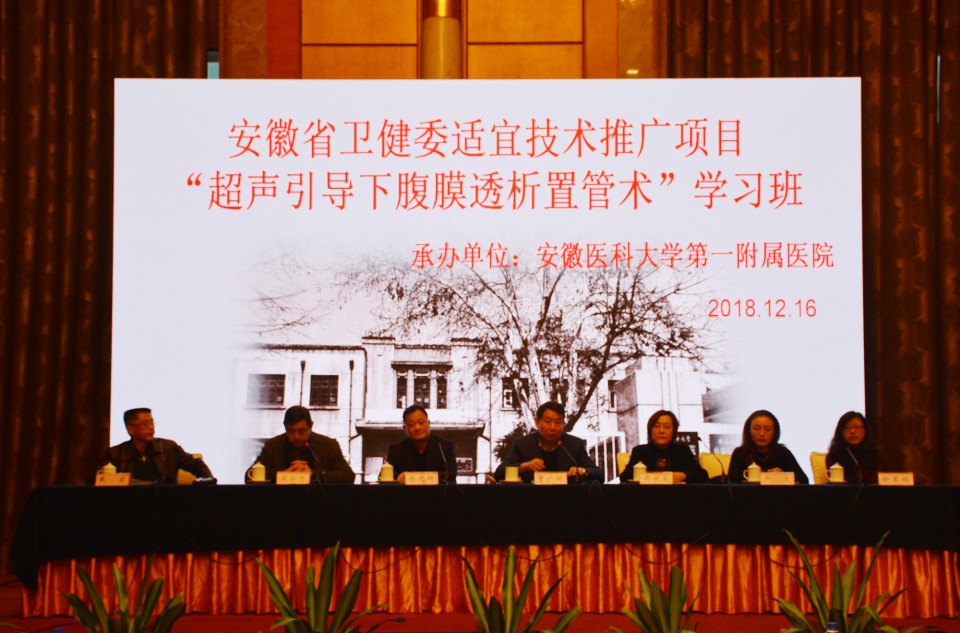 为全面落实安徽省卫健委适宜技术推广工作,提高县级公立医院医疗技术水平,由我院肾内科主办的安徽省卫健委适宜技术推广项目“超声引导下腹膜透析置管术”学习班于2018年12月16日上午在合肥举行。副院长费广鹤、肾内科主任吴永贵分别在开幕式上致词。包括省内41家市县级医院肾内科主任在内的142余名肾脏病学医务人员参加了此次学习班。