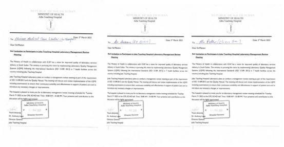3月7日,受南苏丹朱巴教学医院院长安东尼博士邀请,第十批援南苏丹医疗队徐张巍、苏倩和陈鹤参加了朱巴教学医院主办的实验室管理高峰论坛。参加论坛的有南苏丹国家公共卫生实验室主任亚伯、南苏丹国家疾病预防控制中心专家乔尔、朱巴教学医院院长安东尼、检验科主任查尔斯、检验科副主任罗斯、内科主任帕维尔、医务处主任拉雅等近20名专家。
