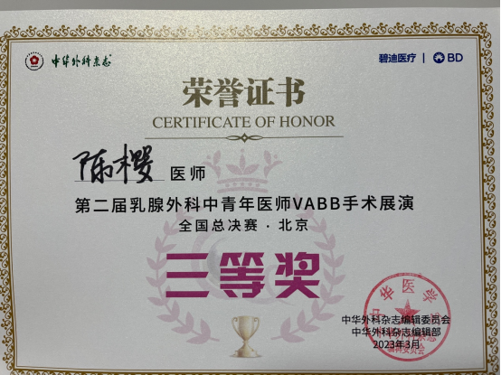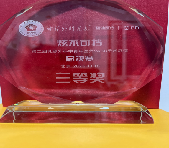 3月18日,由《中华外科杂志》主办的“炫不可挡”第二届乳腺外科中青年医师VABB手术大赛全国总决赛在北京举行。乳腺外科陈樱副主任医师历经海选赛、区域选拔赛、半决赛,一路过关斩将,以半决赛第二名的成绩成功晋级全国总决赛,并在全国总决赛中荣获三等奖,比赛中其规范的手术操作流程和精湛的手术操作技巧得到了全国大咖评委们的充分肯定和一致好评。
