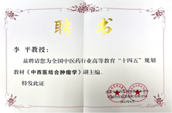 近日,我院李平教授成功当选全国中医药行业高等教育“十四五”规划教材《中西医结合肿瘤学》副主编。自2022 年11月23日起,中国中医药出版社召开了全国中医药行业高等教育“十四五”规划教材主编会议,按照出版社要求,结合各高校申报编委专业结构等情况,在征求多方意见的基础上,经过一系列公平、公正、公开遴选,组建《中西医结合肿瘤学》编委会成员。