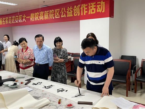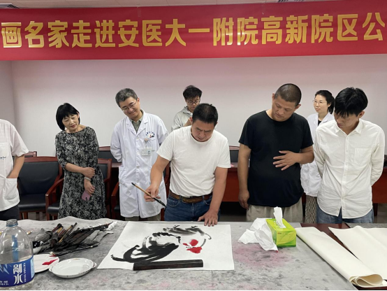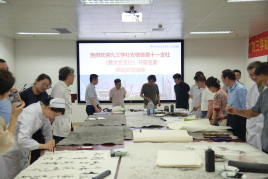 为深入学习贯彻党的二十大精神,迎接中国共产党成立102周年,致敬慰问医务工作者,6月16日下午,九三学社安徽省直十一支社(原文艺支社)主委吴晗华带领7名书画家来到我院高新院区开展公益创作活动。