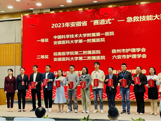 此外,为深入贯彻《进一步改善护理服务行动计划(2023-2025年)》,进一步提升临床护士分析判断能力、决策能力以及团队协作能力,更好地服务患者、服务临床,10月8日,由安徽省护理学会男护士工作委员会、急诊急救护理专业委员联合举办“赛道式”急救技能大赛在中国科技大学第一附属医院举行,共有来自全省28支队伍,112名选手参赛。我院由朱明华、许敏、李晴、王海龙组成代表队,经过激烈紧张的角逐,选手们在理论考核、现场授课、案例分析、技能考核各个环节中沉着应战,不负众望,喜摘桂冠。