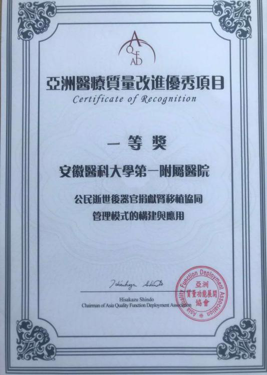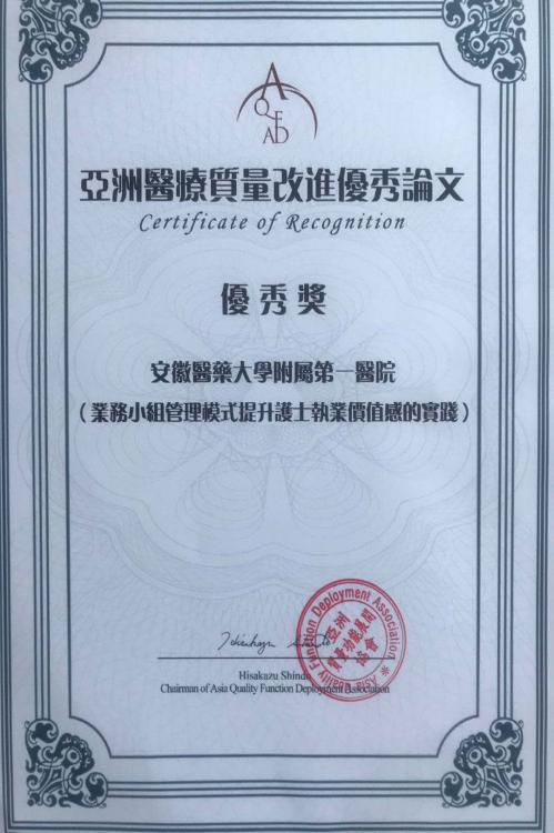 我院泌尿外科“畅畅圈”团队与其他38个优秀团队被邀请参加此次亚洲医疗质量改进项目比赛,本次大赛由来自中国、新加坡、日本等国内外知名国际医疗质量管理专家担任评委。“畅畅圈”3位成员围绕“公民逝世后器官捐献肾移植协同管理模式的构建与应用”这一主题,通过画面精美、内容丰富、严谨专业的全英文PPT结合发音精准、抑扬顿挫、热情洋溢的英文演讲,将该圈的核心理念和内涵,挥洒自如的呈现给评委和观众,得到一致好评,取得比赛一等奖的好成绩。本次大会共颁发3篇优秀论文奖,我院泌尿外科金宗兰护士长题为“业务小组管理模式在提升护士职业价值中的实践”一文荣获医疗类唯一一项优秀论文奖。