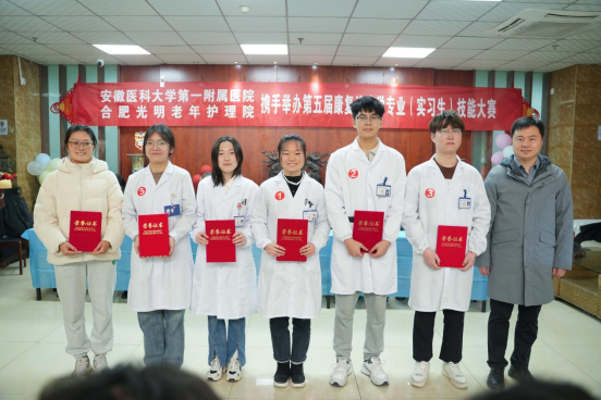 本次大赛邀请了教育处负责人王继年、安徽中医药大学针灸推拿系主任陈朝晖、康复医学党支部宋娟书记、安徽医科大学运动康复系主任陈凯华、安医大一附院北区康复医学科主任陈健、安医大附属巢湖医院康复医学科主任李东霞、安徽医专康复医学系主任石淑霞七位专家担任大赛裁判。共有来自安徽医科大学、安徽中医药大学、安徽医专等六所省内高校在我院实习的康复治疗学专业本专科学生组成的6支代表队,各位参赛队员精心准备、斗志昂扬。经过最终角逐一等奖1名,二等奖1名,三等奖1名,最佳选手1名,最佳领队1名。