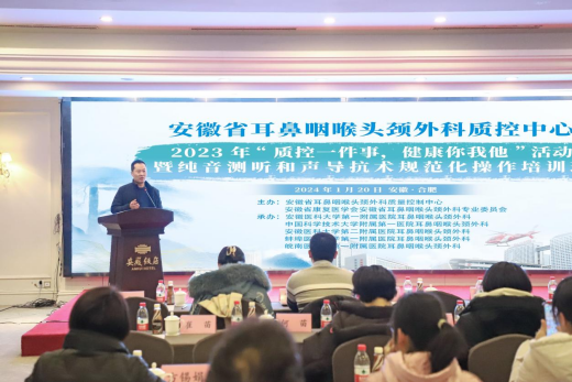 为提高全省医疗机构的基本听力检测水平,围绕安徽省卫建委制定的“质控一件事,健康你我他”的主题活动,1月20日,安徽省耳鼻咽喉头颈外科质控中心在安徽饭店召开纯音听阈检测和声导抗术规范化操作培训班。培训班由我院耳鼻咽喉头颈外科童步升主任主持,耳鼻咽喉头颈外科质量控制中心主任刘业海教授发表开幕式讲话。安徽省各市县市级医院的100余名从事听力学检查的专业技术人员参加本次培训。