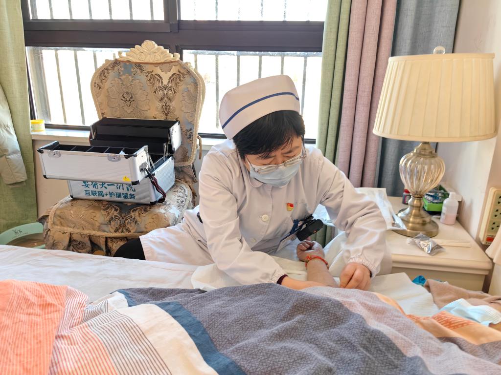 上午8时许,安医大一附院“互联网+护理服务”工作室接到一例糖尿病居民的“互联网+护理服务”首单预约,经过在线与患者沟通交流,充分了解患者诉求,护理部主任胡少华带领内分泌科护士长孙小红等护理骨干准备好用物,一同前往合肥市蜀山区某居民区,为空巢老人进行网约上门服务。