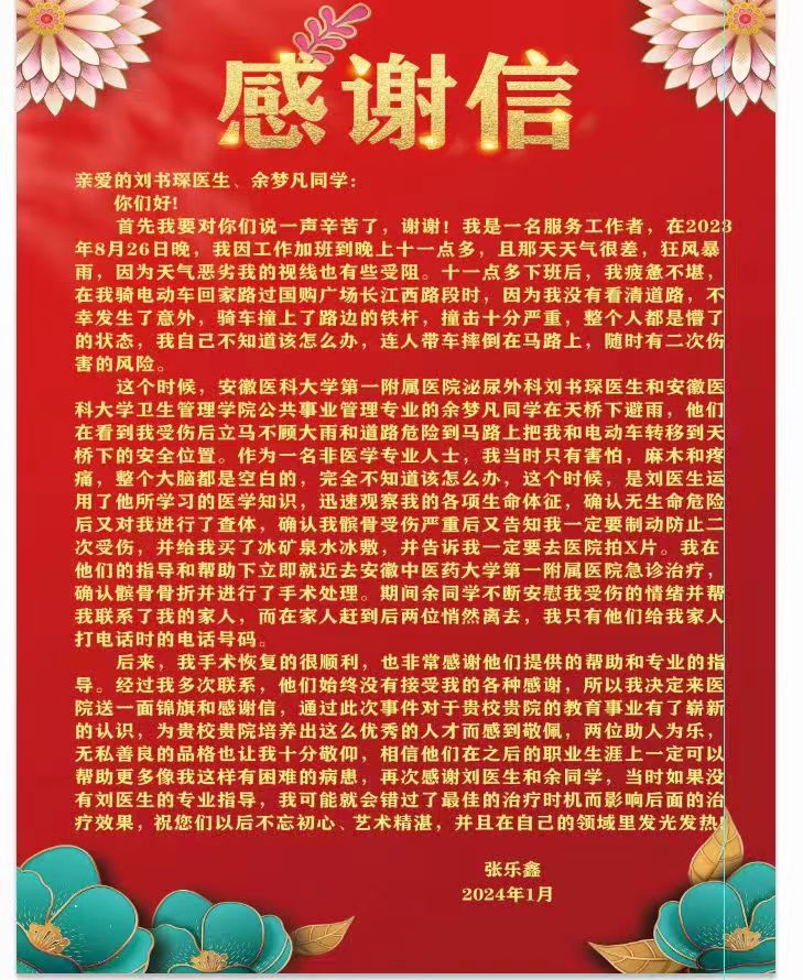 2月5日上午,合肥市张女士将一面写有“助人为乐古道热肠、医者仁心济世救人”的锦旗和感谢信送至我院泌尿外科,揭开了我院泌尿外科研究生刘书琛见义勇为的暖心故事。