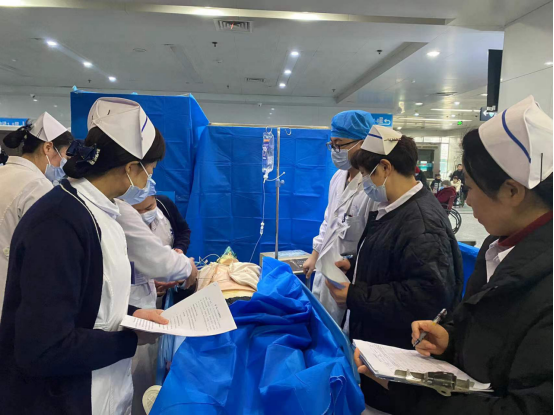 15:00,急诊科接到模拟120电话,一家化工厂车间粉尘起火爆炸,大批伤员患者即将来我院救治。急诊科护士迅速反应,逐级汇报,护理部立即展开联动反应,由急救经验丰富的科护士长、护士长组成应急演练小组,组织调配16个病区不同层级的急危重症技能护士参与救治。护士在指定时间内携带相应急救仪器设备到达演练现场,迅速组成一个4人的应急演练小组,结合多发伤、左上肢外伤(孕妇)、颅脑外伤伴颈胸椎损伤、心力衰竭的情景案例模拟抢救。参与演练护士在参与抢救处置、院内转运、病区交接等环节中处置妥当,能准确判断患者存在的主要和关键护理问题,采取适当的护理措施。护士们反应敏捷、分工明确,有条不紊地对模拟对象或标准化患者进行紧急救治。16:10,经过一系列紧张而有序的抢救,4名患者均得到妥善处置,应急演练圆满结束。