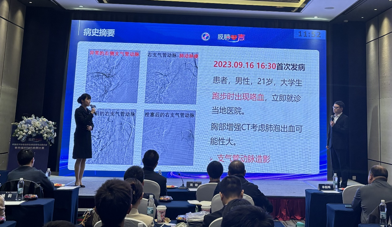 从网上征选病例开始,急诊ICU病区负责人丁振兴统筹安排,精心挑选出参赛选手及病例。赛场上,朱甜甜、岳彩鹏配合默契,以“万般凶险,魔肺护航”为主题,通过流利热情的演讲,阐述了一名21岁患有先天性血管畸形的大学生在急诊ICU医护团队精心救治下转危为安的动人故事。该患者曾几度咯血不止,生命危在旦夕,在我院医务处的协调下,急诊ICU与介入科、耳鼻喉科、呼吸科、胸外科、麻醉科、感染科等科室通力合作,在ECMO的支持下完成了右肺切除术,并度过术后难关,成功挽救了患者的生命。经过默契配合与生动展示,团队最终脱颖而出,夺取了进入华东区半决赛的宝贵名额,展现了我院ECMO团队高效合作的风采。