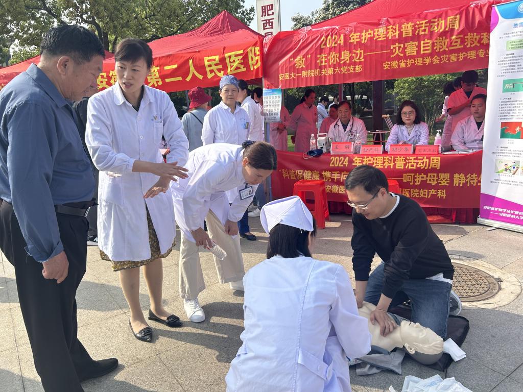 在5·12国际护士节到来之际,4月27日上午,我院医护员工赴肥西参加安徽省护理学会举办的“护理科普活动周”活动。本次科普活动主题为“‘科普促健康 携手向未来'——护佑女性 健康相伴”,由我院护理部主任暨安徽省灾害护理科普教育基地负责人胡少华牵头组织,参与本次科普活动的有我院中华护理学会全国护理科普教育基地、安徽省灾害护理科普教育基地人员以及妇产科、呼吸科、内分泌科及老年护理专科联盟的医护人员共计29人。活动形式为讲座、展板、视频、实操等,旨在向居民宣传科普知识,开展健康义诊咨询,守护百姓健康。